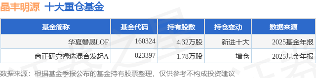根据2025基金年报公募基金重仓股数据,重仓该股的公募基金共2家,其中持有数量最多的公募基金为华夏基金的华夏磐晟LOF。华夏磐晟LOF目前规模为0.7亿元,最新净值2.2141(1月27日),较上一交易日上涨5.19%,近一年上涨39.02%。该公募基金现任基金经理为刘洋。刘洋在任的基金产品包括:华夏创新视野一年持有混合A,管理时间为2025年3月3日至今,期间收益率为31.61%。